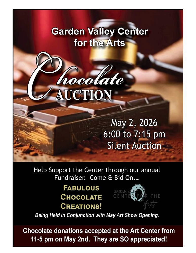 will be held in conjunction with the opening of the May Show featuring the art of students of Virgia and Robert West. This years auction returns to Chocolate focus amidst the artists of the month's work on display for May. You are encouraged to take part by donating your CHOCOLATE CREATIONS